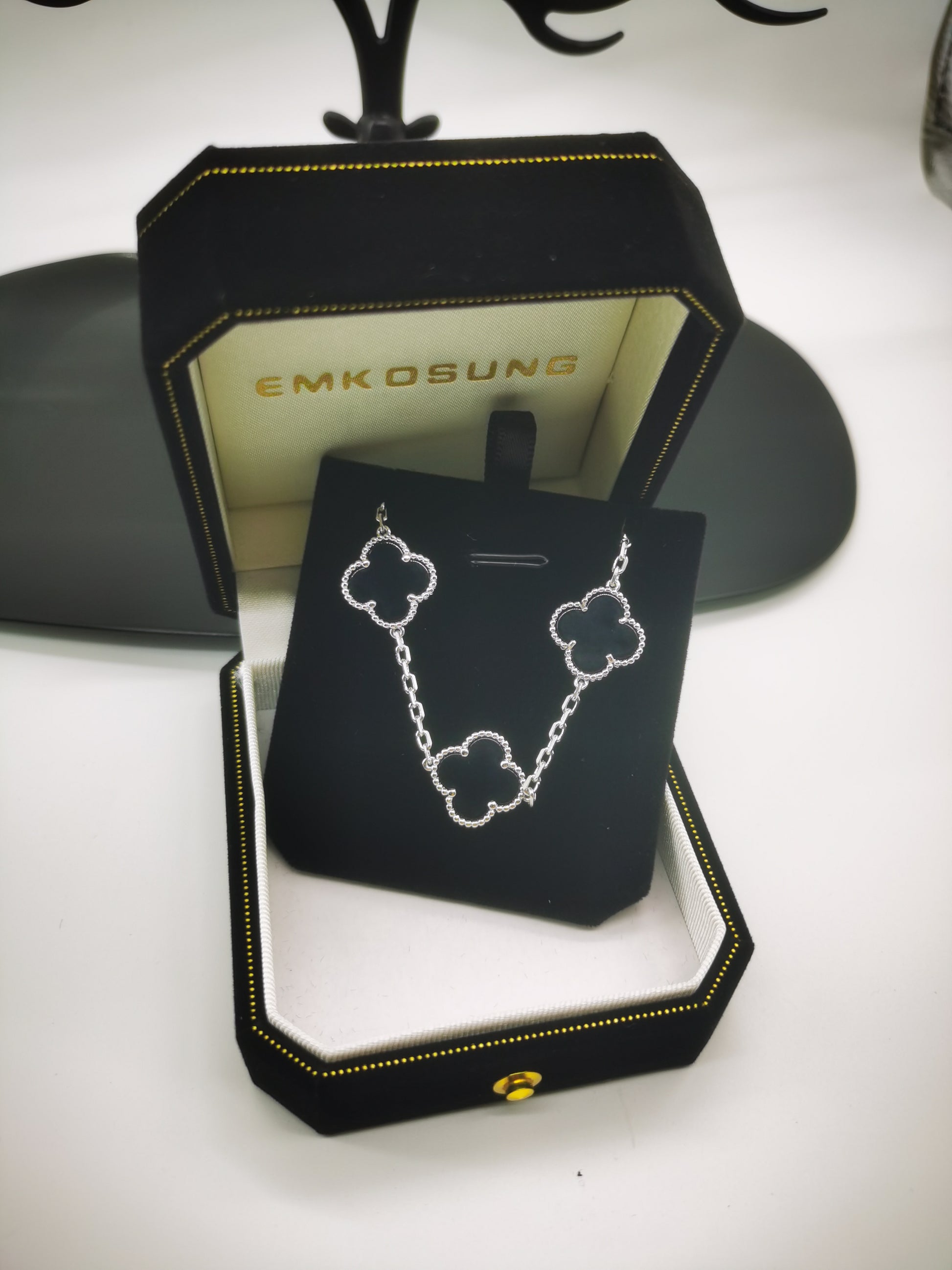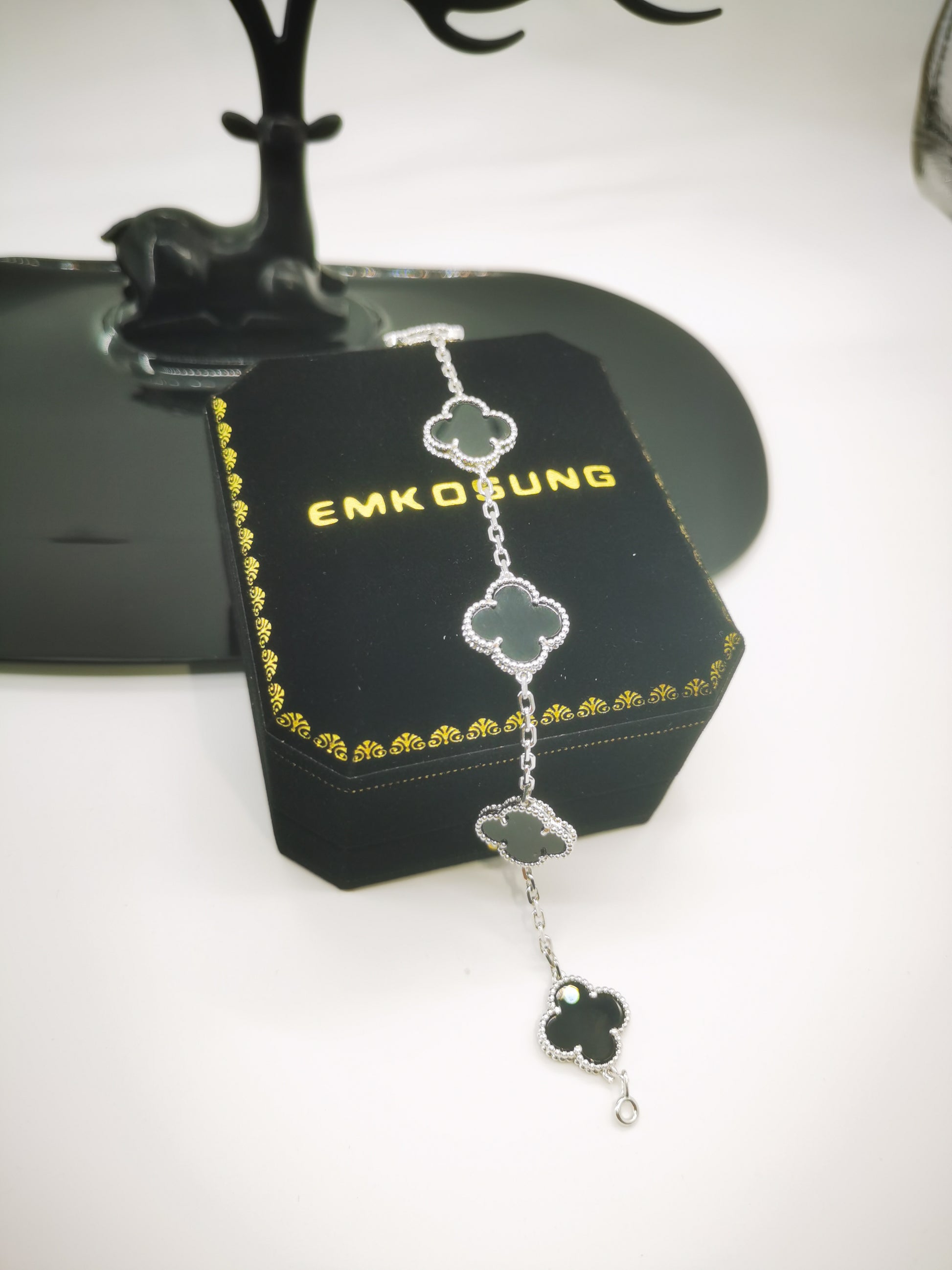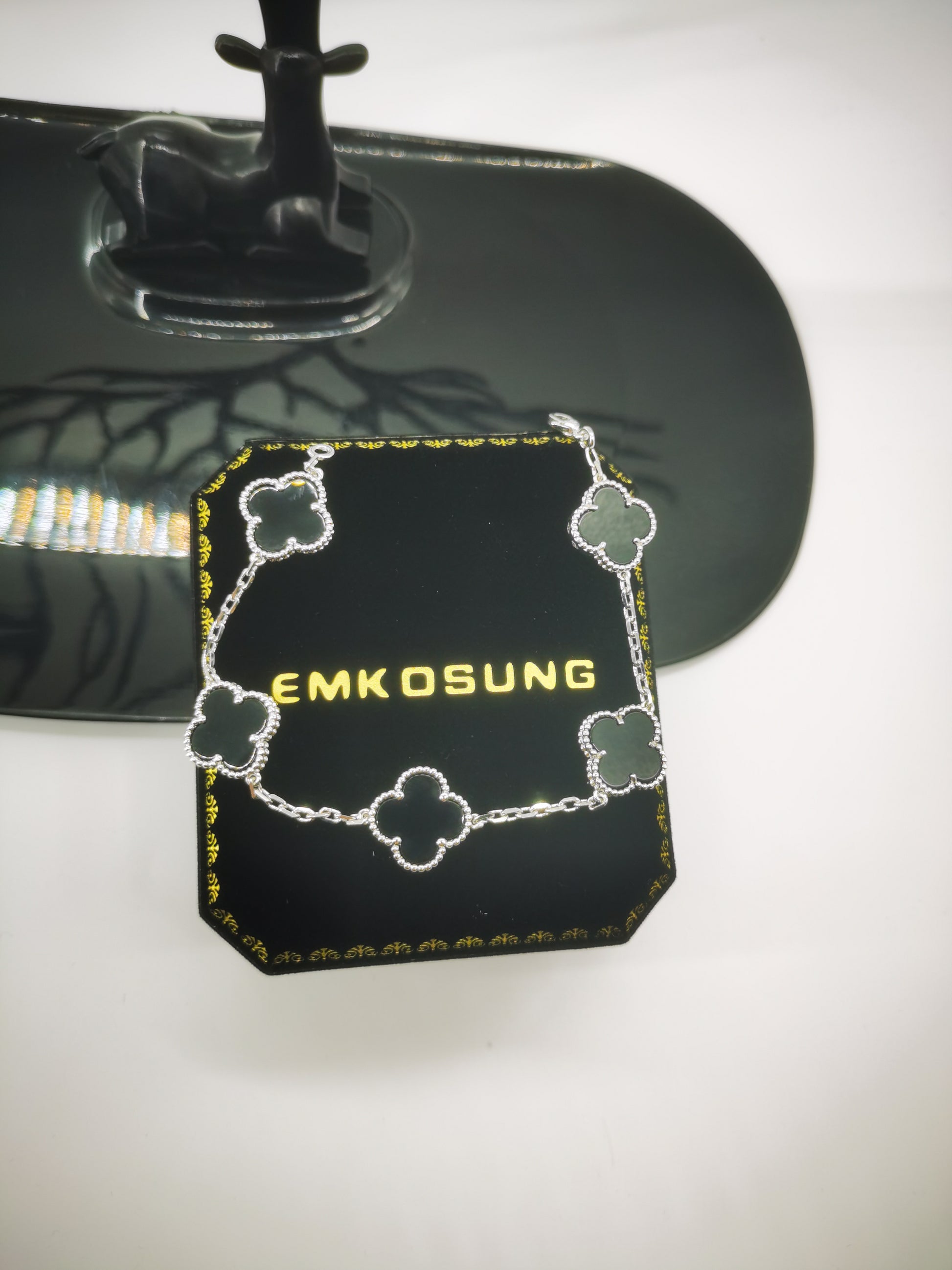 EMKOSUNG 18K Gold Plated Unique Four Leaf Clover Silver Bracelets for Women , Fashion Bracelets Gifts for Women with Exquisite Jewelry Box ( Black—Silver Chain)